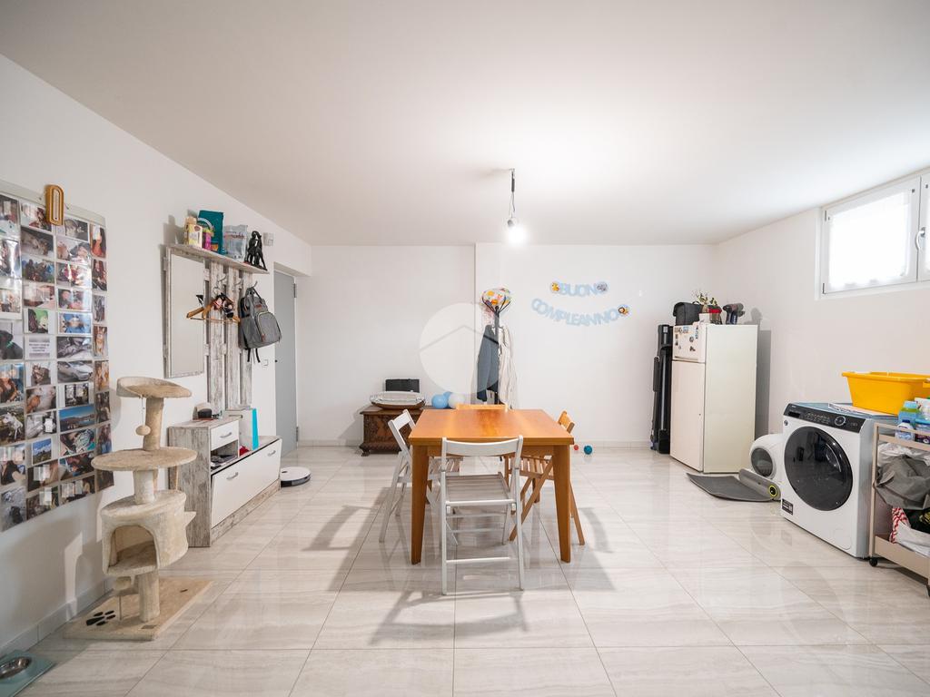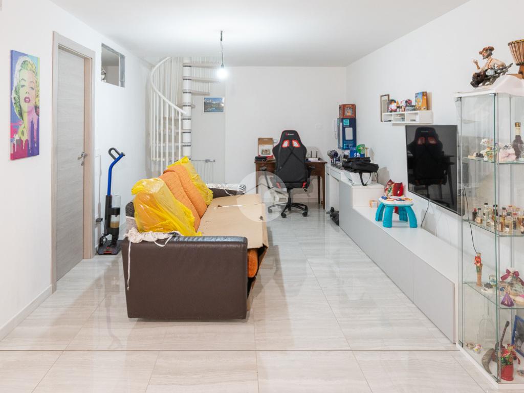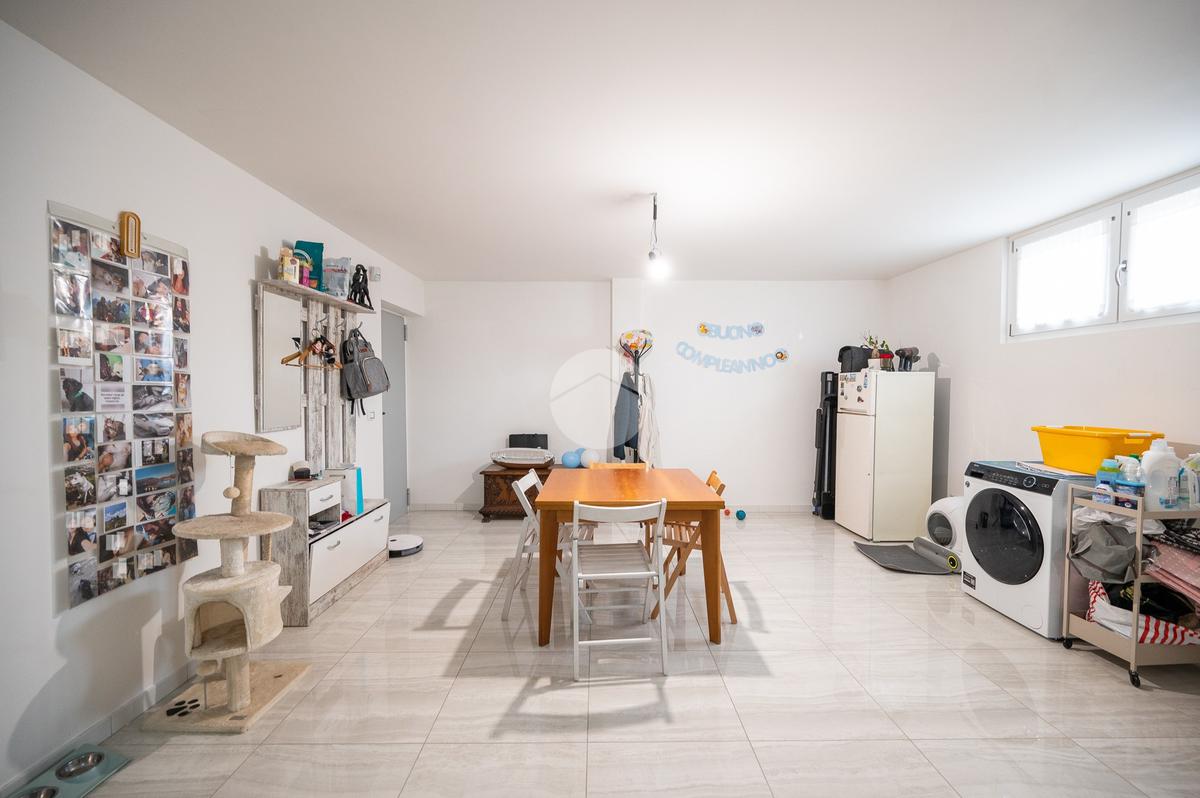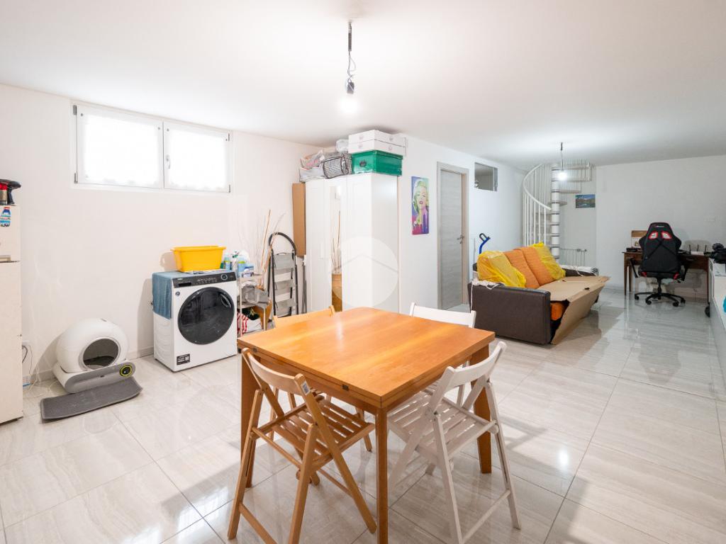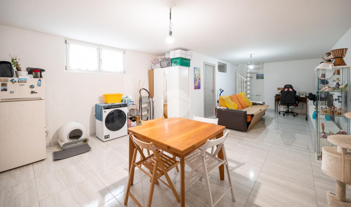 Una comoda scala interna a chiocciola conduce al piano inferiore, ragiungibile anche dal vano scale esterno, dove si sviluppa una spaziosa tavernetta attualmente organizzata come open space. È inoltre presente un secondo servizio, dotato di attacchi per la lavatrice.