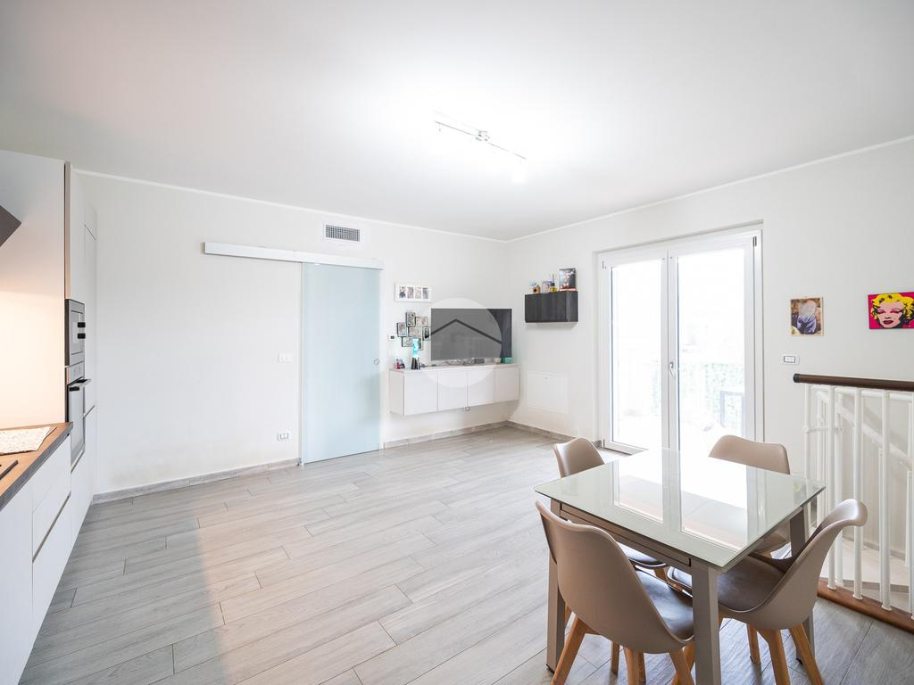 L’immobile si sviluppa su due livelli abitativi. Dall’ingresso si accede direttamente alla luminosa zona giorno open space con cucina a vista, dalla quale si ha sfogo sul terrazzo e, tramite una scala in ferro, al giardino privato dell’abitazione di circa 110 mq.