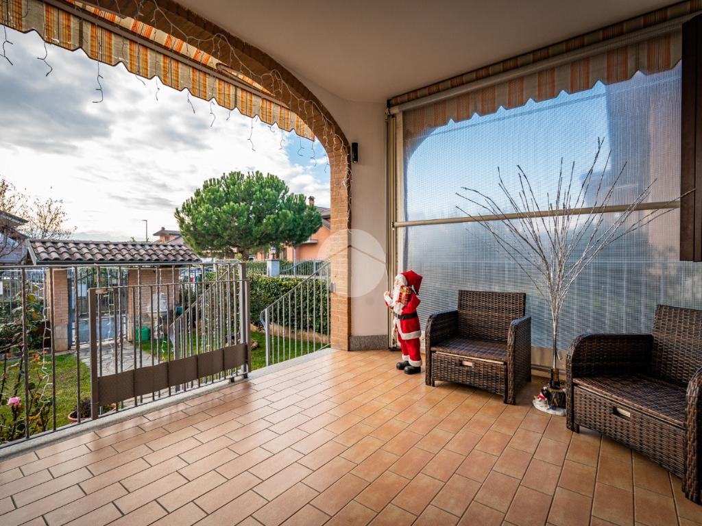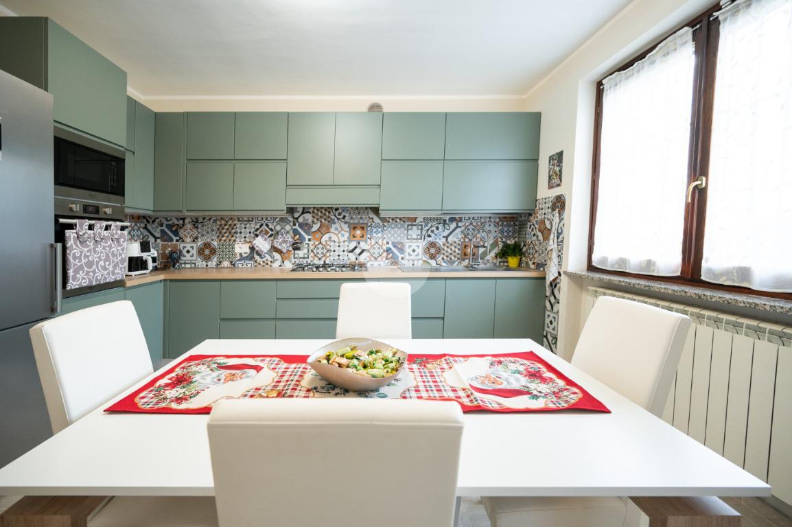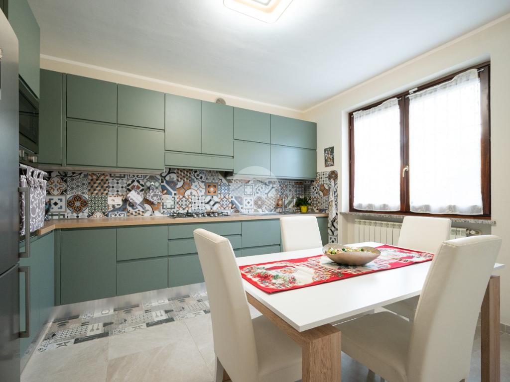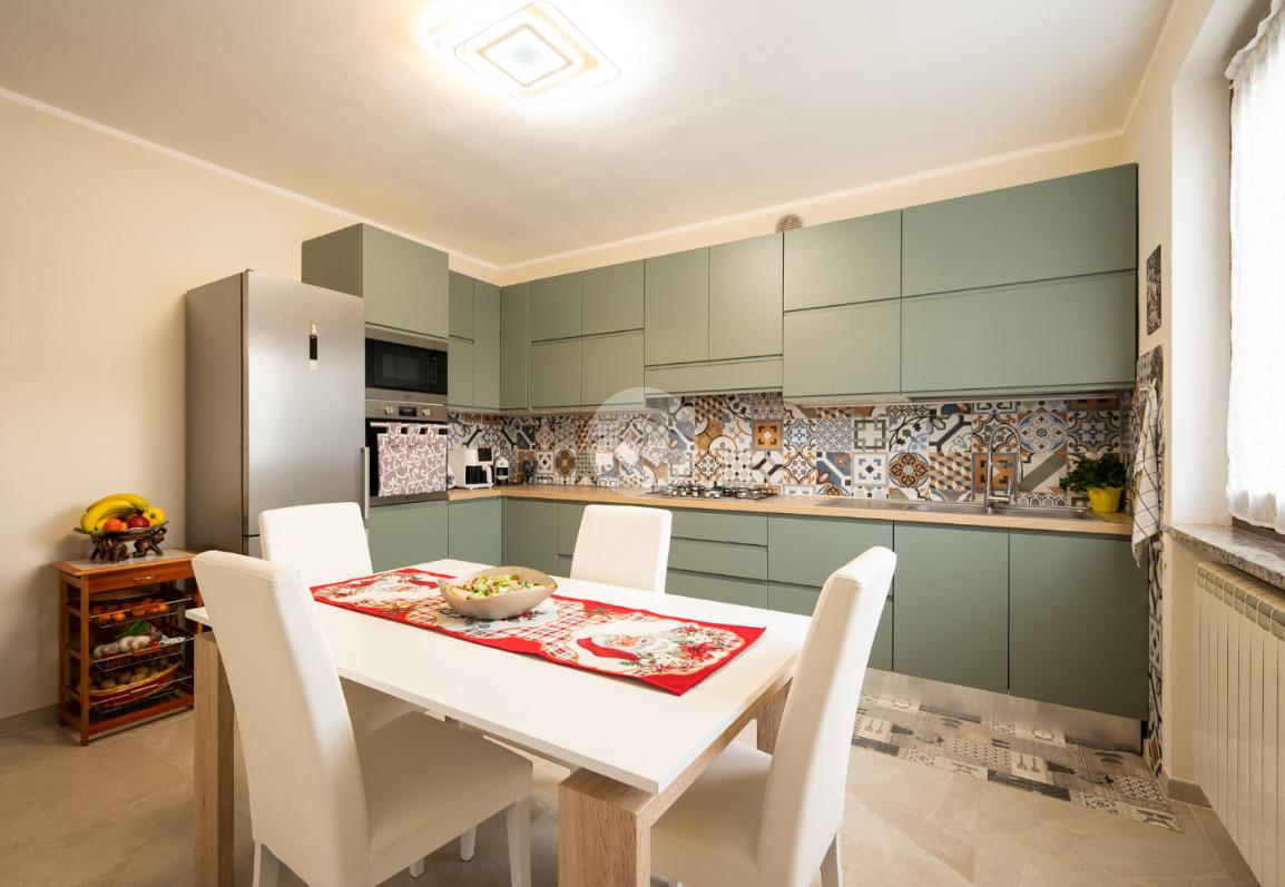 Dal doppio portone blindato si accede alla zona giorno, composta dal salone e dalla cucina abitabile dalla qualche si accede, tramite porta finestra, al patio coperto comodamente fruibile e munito anche di tenda da sole e tenda veranda.
